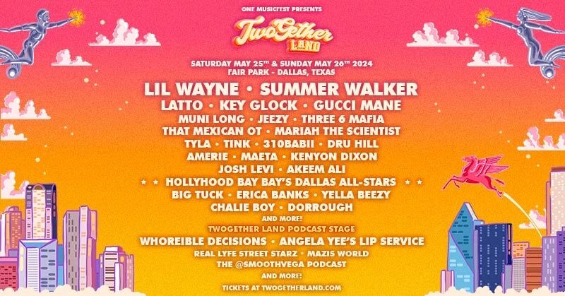 Dallas Memorial Day Weekend 2024 – The newest urban music festival in the Southwest, TwoGether Land, will take place at the historic Fair Park in Dallas on Saturday, May 25 and Sunday, May 26. Following the success of ONE Musicfest . Lil Wayne, Gucci Mane, Latto, Summer Walker, Jeezy, Three 6 Mafia, Tyla, Muni Long, Dru Hill,and more, the event promises to deliver unforgettable performances. DFW rapper Yella Beezy is also expected .